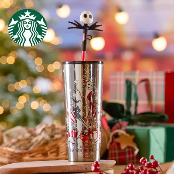 Take a look at this new Nightmare Before Christmas Starbucks Tumbler! The tumbler is decorated with a gorgeous design. It’s coming out for spooky season, but it honestly feels more like a Christmas tumbler. The cup features Jack Skellington in his Santa outfit, standing in front of a Christmas tree. Presents and other characters from the iconic Tim Burton movie are all around the tumbler.