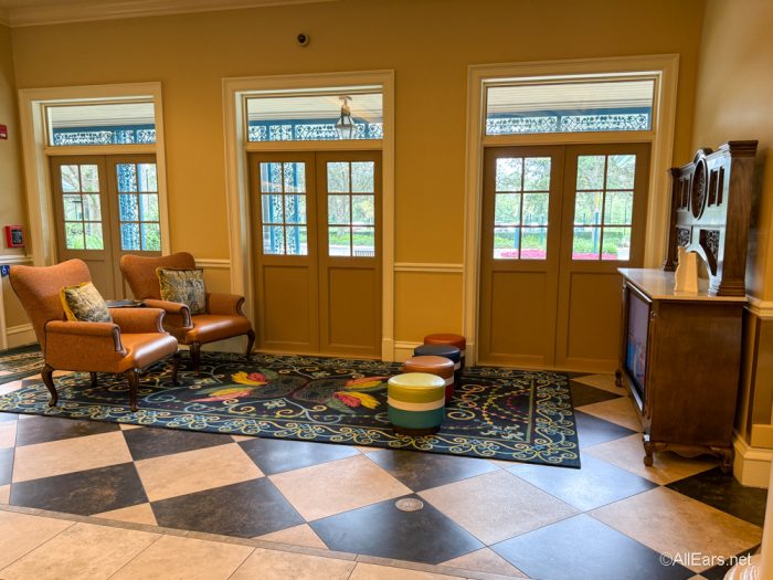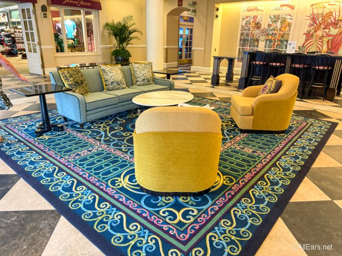 The lobby refurbishment at Disney’s Port Orleans Resort — French Quarter is complete, and it’s looking nice, bright, and lovely! First, some vibrant new rugs have entered the chat, and they’ve really got the place HOPPING.