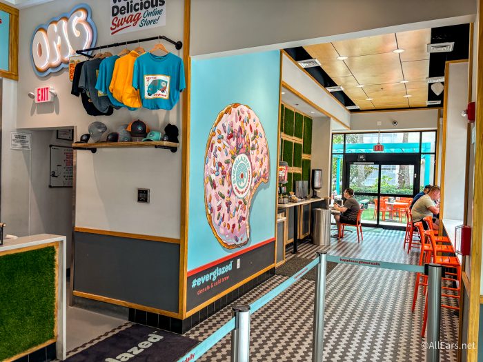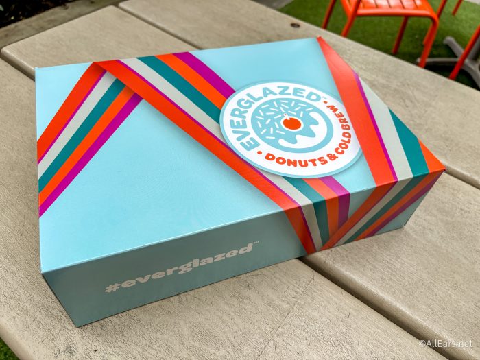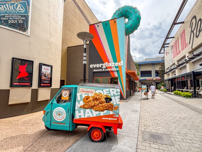You will find Everglazed Donuts & Cold Brew on the West Side of Disney Springs. It can be a bit easy to walk right past, as it is located down a side street between Splitsville Luxury Lanes and the AMC Theater. However, if you know where to look, it is easy to spot!