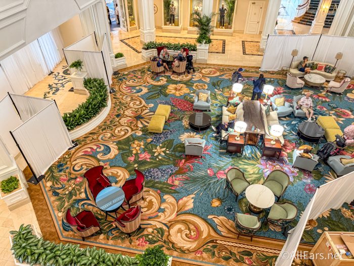 The carpet is so bright! It’s inspired by “Victorian-inspired borders and scrollwork featuring hand-drawn florals inspired by turn-of-the-century botanical studies.” I see a few hidden Mickey heads in there, too.