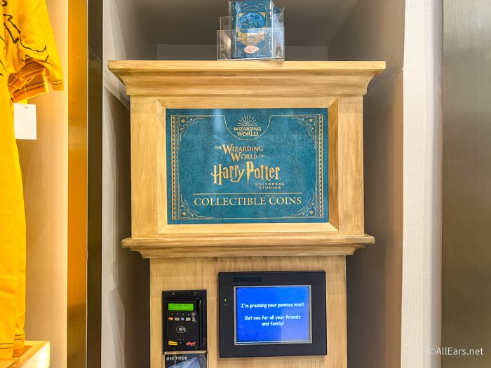 Over in the Universal Studios Store, right inside the very far right door (if you’re walking towards the parks, it’s the closest you can get to Universal Studios before you have to walk out of the store), you’ll find a Wizarding World of Harry Potter Pressed Penny machine!