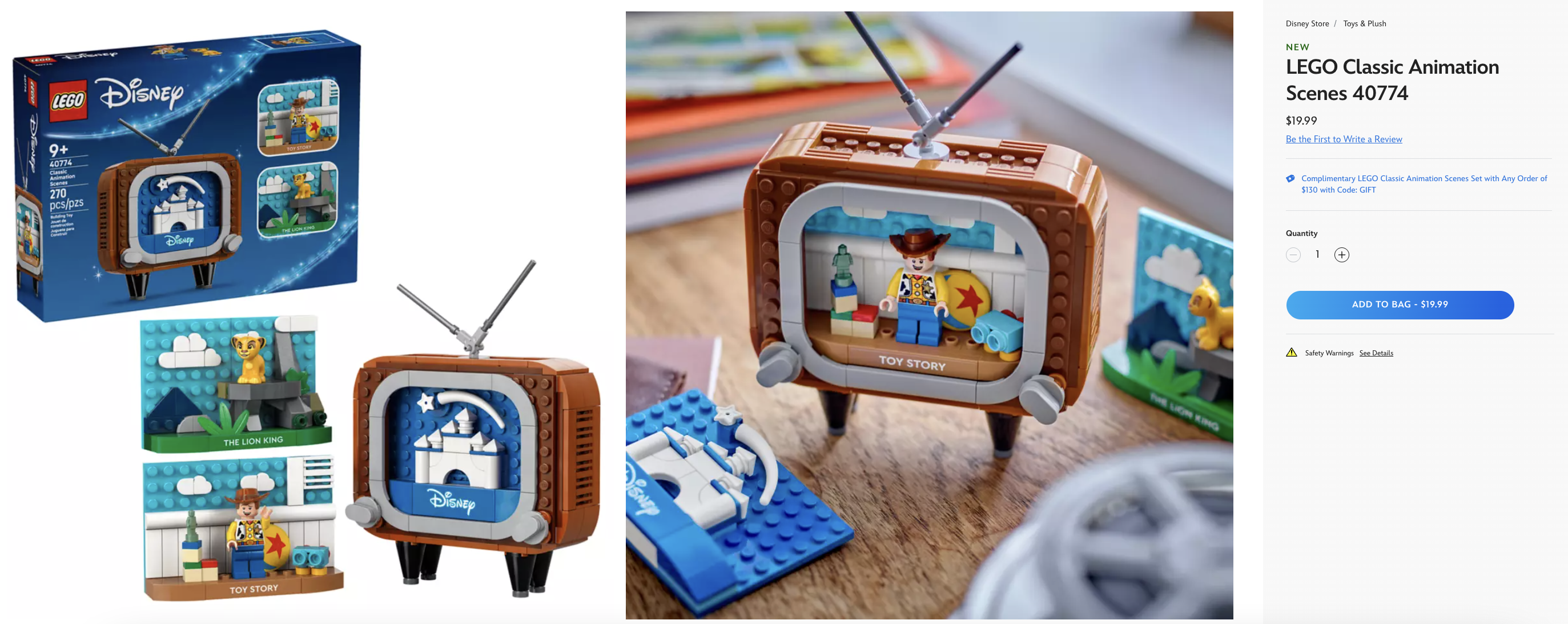The set is a mini LEGO TV (how clever!), and you can switch “channels” between the classic Disney castle intro, Toy Story, and The Lion King. It’s a pretty cool and unique set that we’ve never seen before. When you’re making your purchase, make sure to use the code GIFT to get the set!