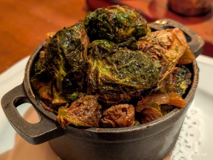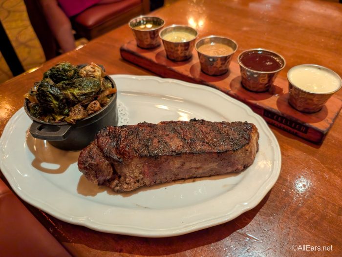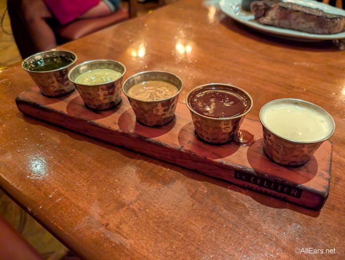 Of course, Le Cellier is a steakhouse, too, so we had to try the 12-oz. New York Strip Steak for $62. It comes with a side, so we went with Crispy Brussels Sprouts. Even better, though? You can get a Sauce Flight to go with that steak for $9. You’ll get Chardonnay-Truffle Butter, Cabernet Demi, Cognac-Peppercorn, Béarnaise, and Sauce Verte.