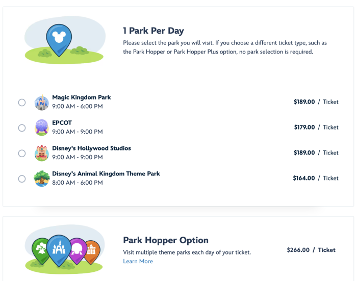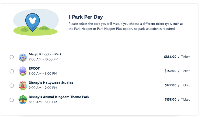 As you can see, prices start creeping up a bit as you move deeper into the month. Animal Kingdom stays the most affordable park across all of these days, usually sitting under $170. Magic Kingdom, on the other hand, jumps the most quickly — it hits about $200 by mid-month. That’s about a $26 difference compared to the cheapest dates, which adds up fast if you’re buying tickets for a family.