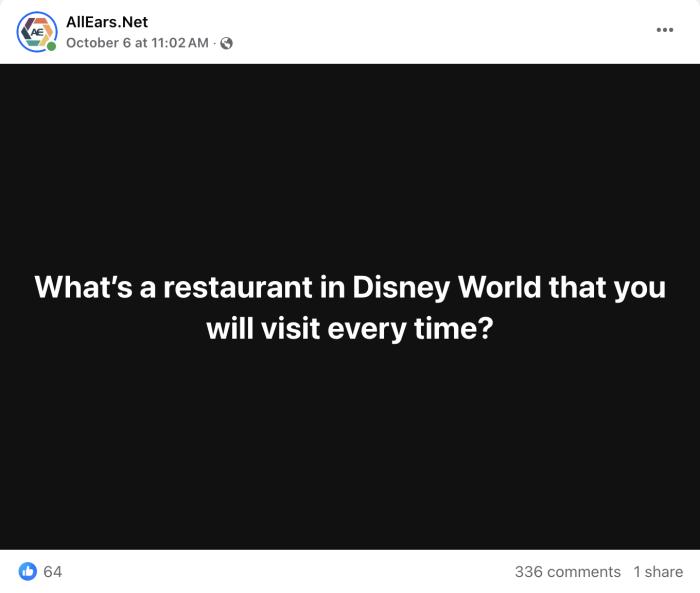 As we mentioned, we reached out to our followers on Facebook and Instagram to ask: “What’s a restaurant in Disney World that you will visit every time?”