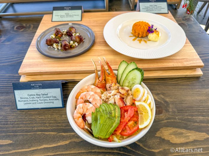 The restaurant will offer an elevated experience with seasonal items, as well as Disney-inspired dishes like Walt’s Chili and the Brown Derby Salad. The full menu for this restaurant hasn’t been released yet, but we did get to peek at some of the food items that will be available at Cotino.
