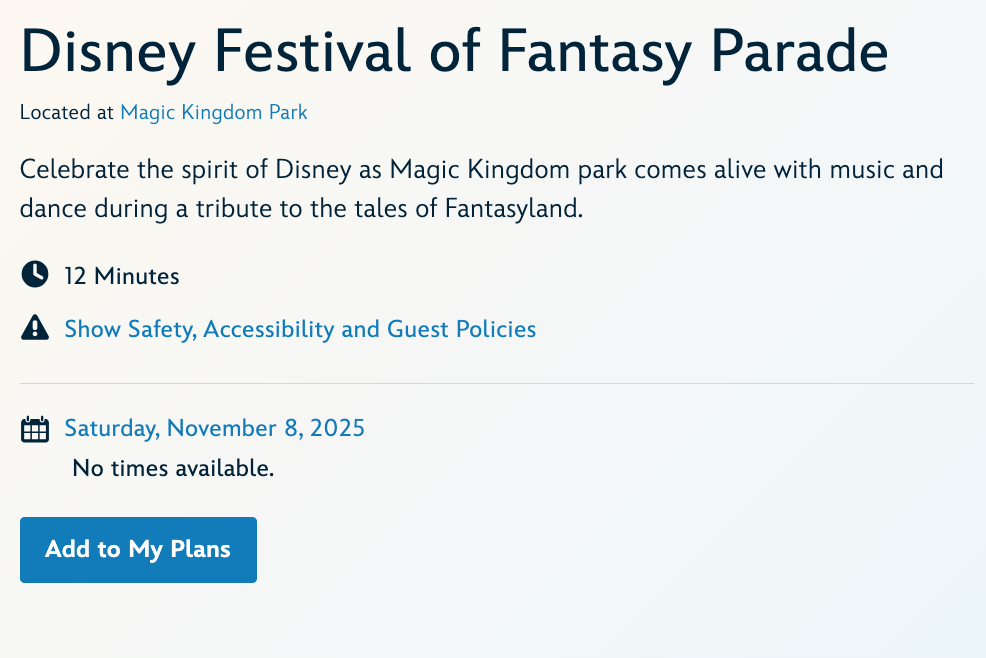 Disney has not publicly confirmed its filming schedule yet, but we have a strong feeling that the removal of the Festival of Fantasy Parade on November 8th and 9th means that Disney has plans to film “Mickey’s Once Upon a Christmastime Parade” as part of ABC’s 2025 Disney Parks Holiday Specials.