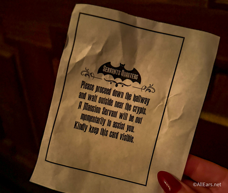 Did you know that you can actually SKIP the Haunted Mansion stretching room? It’s true! Once you get to the end of the queue, right in front of the wooden doors before the pre-show, talk to a Cast Member. Ask the Cast Member at the wooden doors for a way around the preshow, and they’ll give you a printed slip that says “servants quarters” on it.