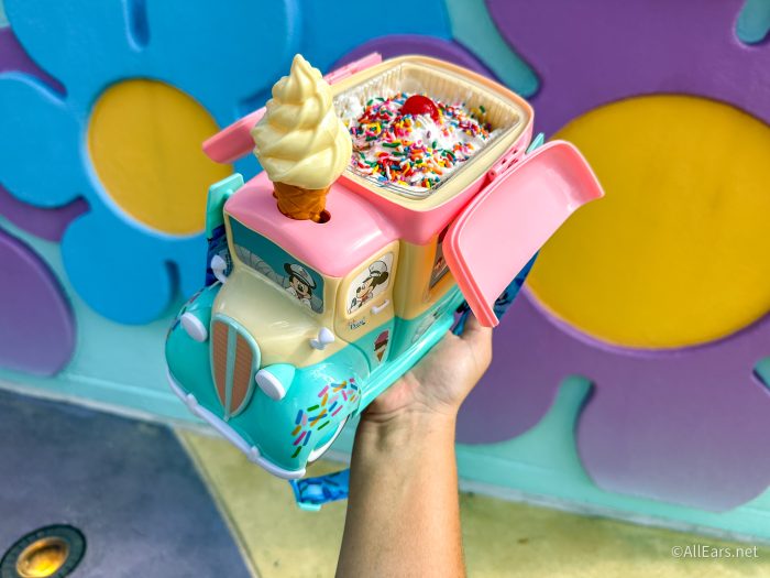 Get ready for one of the sweetest (and cutest!) treats you can find at Pop Century — the Ice Cream Truck Sundae! This massive sundae costs $27.79 and comes with your choice of soft-serve, chocolate sauce, whipped cream, rainbow sprinkles, cherries, and SNICKERS bar pieces, all served inside an adorable Mickey’s Ice Cream Truck souvenir. The best part? The ice cream sits in a plastic tub that fits right inside the truck, keeping everything neat and tidy. You’ll find it in the newly added ice cream section inside the food court, and while it’s definitely a splurge, it’s the perfect over-the-top dessert to share.