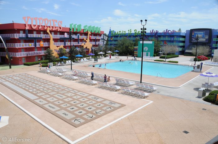 Yep, you read that right! Pop Century’s Computer Pool is one of the most underrated and coolest spots to take a dip. Shaped like a giant computer complete with a keyboard and floppy disks (remember those?), it’s themed perfectly for the ‘90s section of the resort. The Computer Pool is a bit quieter than the main Hippy Dippy Pool, making it a great spot to relax while still soaking in those playful retro vibes.