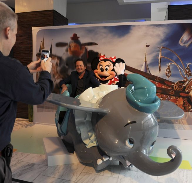 Actor Michael J. Fox, along with a Dumbo ride vehicle, was on hand to help Disney launch its Let the Memories Begin promotion in September 2010 at a posh Manhattan restaurant.