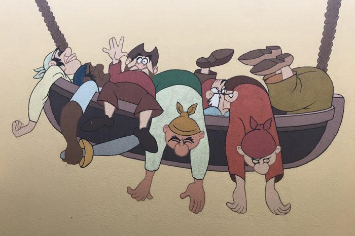 This photo shows a mural with a bumbling band of buccaneers, hanging on for dear life from a lifeboat. Turns out, they are members of Capt. Hook’s nefarious ne’er-do-wells. That’s the easy part.