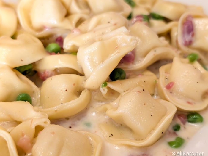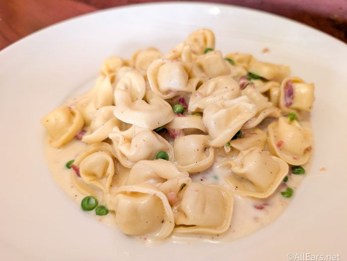 The tortellini was an easy standout and one we’d recommend to just about anyone. It’s the kind of dish that feels both comforting and a little indulgent — something that could easily earn a “must-try” spot on any Disney World dining list. The pasta itself was al dente, filled with rich cheese, and coated in a creamy Parmesan sauce that leaned more toward cozy than fancy.