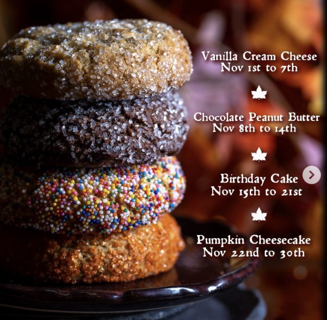 Stuffed Sugar Cookies have been a massively popular new offering at Gideon’s Bakehouse, and this month, there are FOUR different flavors you can try throughout the month! From November 1st-7th, the first flavor available is the Vanilla Cream Cheese, which is the OG stuffed Gideon’s Cookie — a Vanilla Bean Sugar Cookie stuffed with a Cream Cheese Frosting.