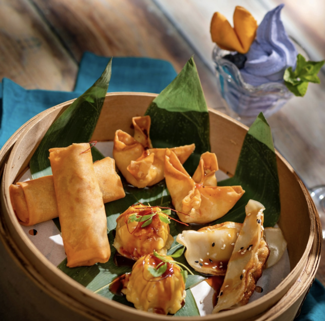 In Disney’s photo above, it looks like the four dim sum dishes on the plate are Cheesy Crab Wontons, Chicken Pot Stickers, General Tso’s Chicken Shumai, and Vegetable Spring Rolls, but as you get your choice of these options, it’s likely that you can customize them how you’d like. As for the dessert, Nine Dragons currently has three on their menu, and you’ll be able to select one: Chocolate Hazelnut Crepe Cake, Ube Cheesecake, and Mango Pudding.