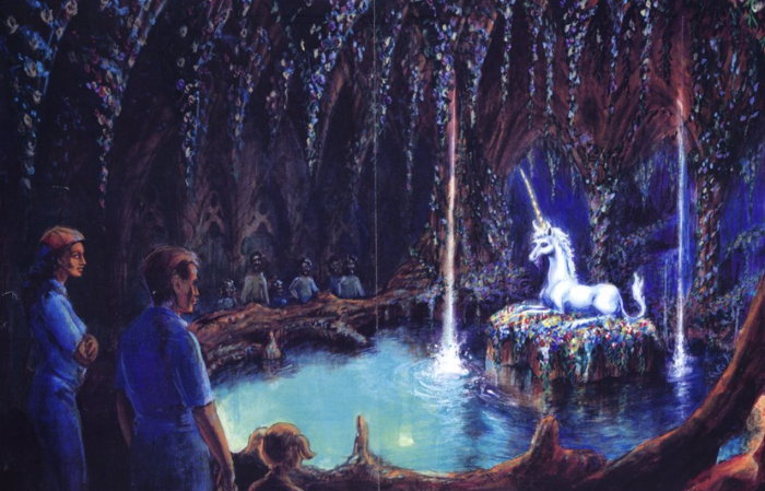 The “good” half of the land would have been built around a walkthrough attraction known as The Quest of the Unicorn. The large maze would have featured numerous “magical” encounters, and culminated with an encounter between guests and a “life-size” realistic unicorn animatronic. This side of the land would have also featured a boat ride attraction titled Fantasia Gardens themed around its namesake film.