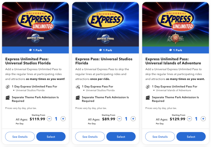 For the standard Express Pass, which lets you skip the regular line once per ride, February 2026 pricing at Universal Studios Florida runs between $110 and $230 per day per guest, while Islands of Adventure ranges from $120 to $240 per day per guest.