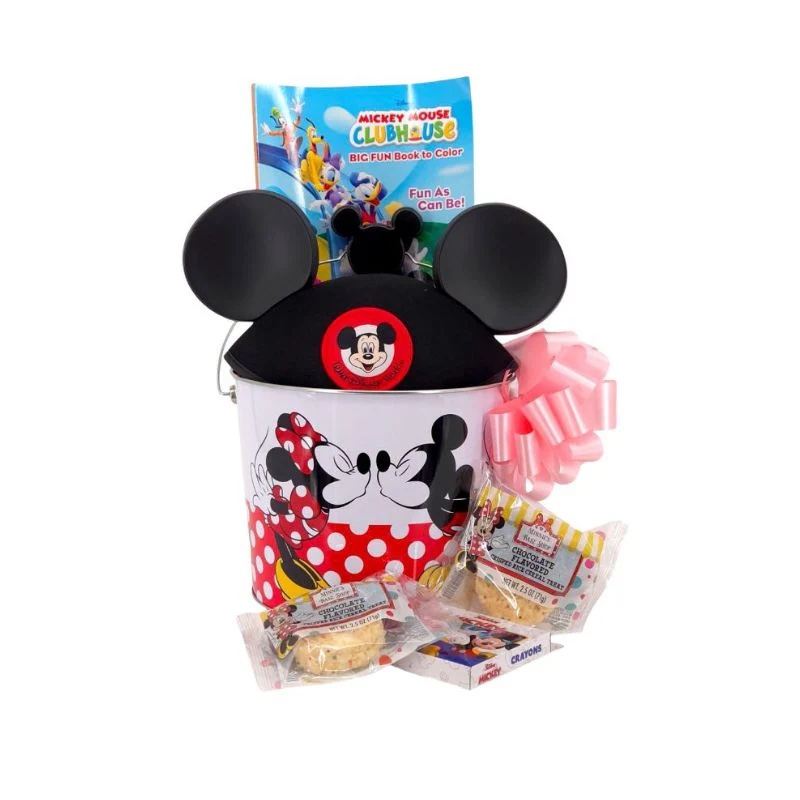 The bucket includes a customizable Mickey Mouse Ear Hat, Mickey Mouse Chocolate Flavored Crisped Rice Cereal Treats, Minnie Mouse temporary tattoos, and a Disney coloring book and crayons. Not to mention, you also get an adorable bucket featuring Mickey and Minnie!