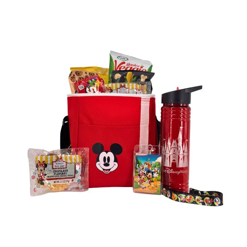 The pack is filled with assorted snacks and treats, a refillable castle water bottle, and a Mickey Mouse lanyard. The cooler can hold up to 12 cans and is easy to carry with adjustable straps.