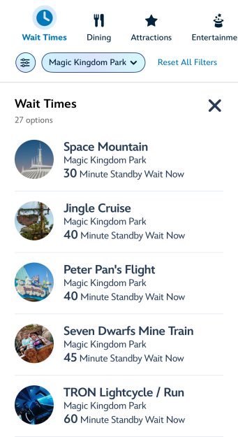 This also means that wait times for the rides are generally higher from 4 PM to 7 PM, too. Around 5 PM, the wait times were pretty moderate — Seven Dwarfs Mine Train was at a 45-minute wait, TRON Lightcycle / Run sat at 60 minutes, Jingle Cruise (the holiday overlay of Jungle Cruise) was sitting at 45 minutes, and all other waits were mostly below 40 minutes.