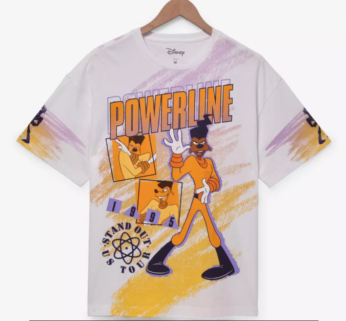 The cult classic A Goofy Movie is back in fashion, and this shirt features the fictional pop‑star Powerline in full “World Tour” mode with vintage‑inspired graphics. It’s a fun blend of throwback style and Disney fandom. It’s perfect for the adult fan who wants something more than the basic Mickey tee.