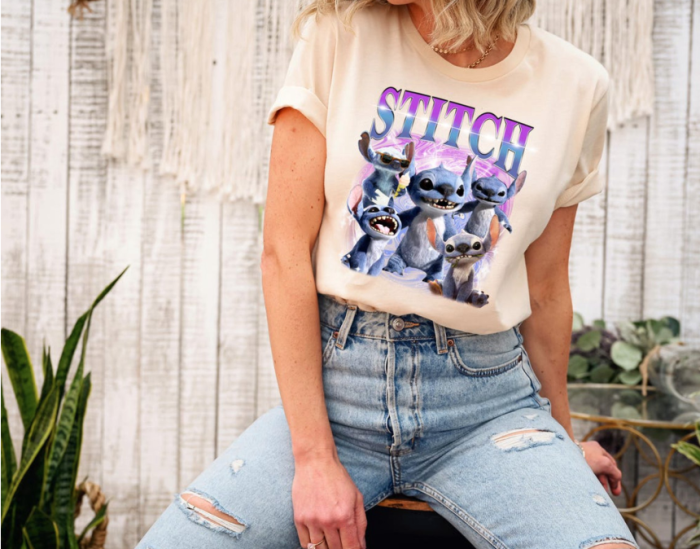 One of the standout picks for your Disney wardrobe is this “bootleg-style” Stitch tee. It hits the sweet spot between playful park outfit and everyday casual, with a bold graphic of our favorite alien and a purposely off-beat vintage-inspired print.