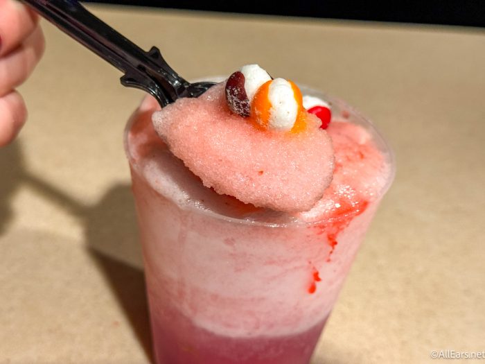 Of the two beverages, this one is the standout! It’s essentially a pink lemonade slushy, but with some fun toppings. The cotton candy helps mix up the flavors, and the Skittles give a unique chewy element. Definitely one the kids will love!