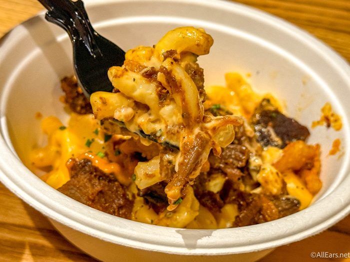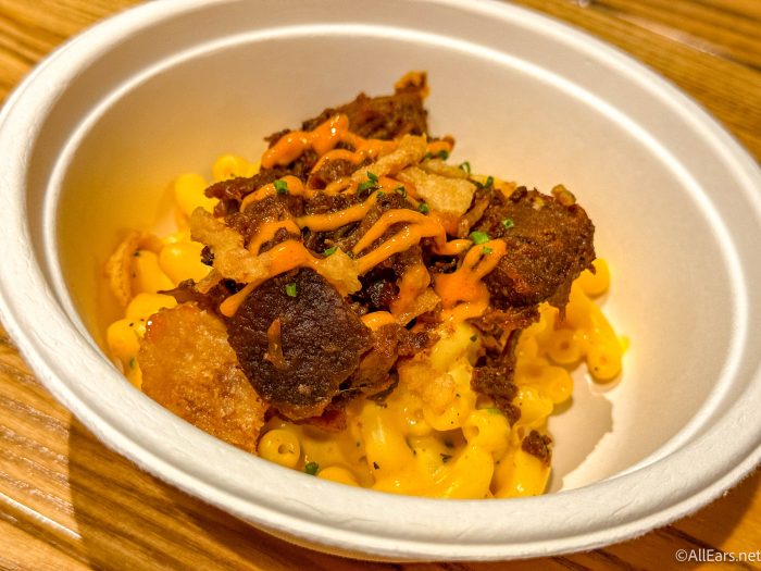 Welcome to Backlot Express, where we’re trying several items, starting with the Hickory Holiday Mac, which is macaroni & cheese with burnt ends, crispy onions, and chili pepper sauce for $6.49.