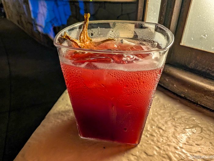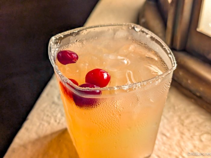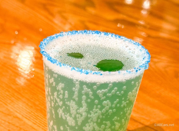 At one of the snack carts, you’ll find the Blue Sparkling Cider, which is white cranberry juice, guava syrup, blue curaçao syrup, lime juice, and sparkling apple cider with a blue sugar rim and sugar snowflake. It’s $5.49.