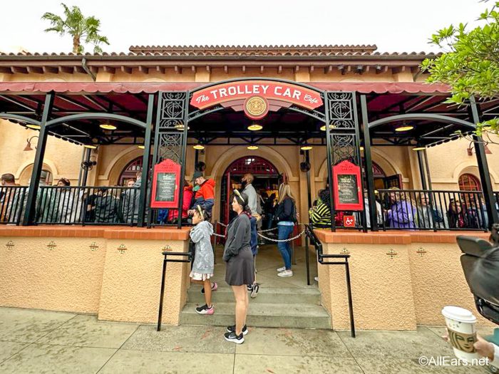 The Trolley Car Café is the Starbucks location in Hollywood Studios. It’s located at the corner of Hollywood Boulevard and Sunset Boulevard, straight in from the entrance of the park. You can get your standard Starbucks order here, including coffee, lattes, frappacinos, cake pops, breakfast sandwiches, and more.