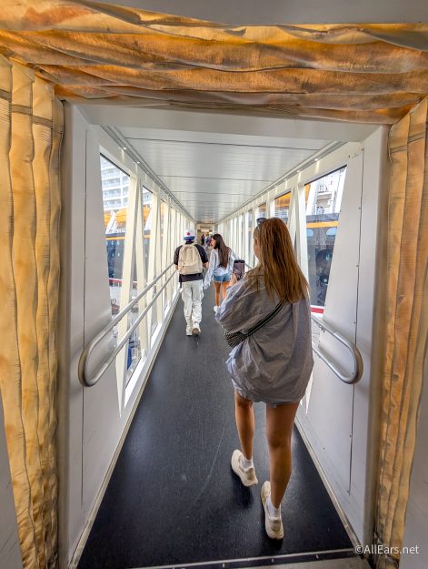 It’s time to go onboard the Disney Destiny for the first time. We love all the Disney touches at the terminal that really help set the vibe for the cruise ahead.