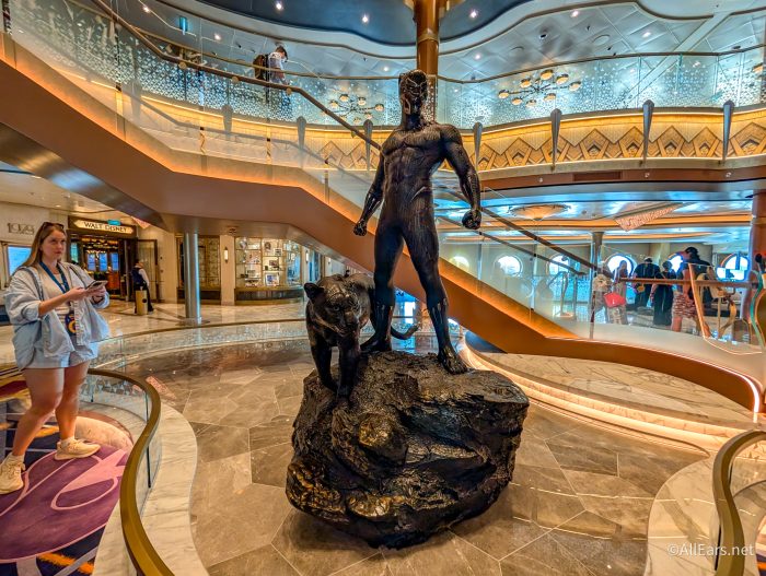 The Grand Hall is the first real experience you get on board the ship, as well as where you’ll meet a lot of characters. In the Grand Hall, there’s a statue of Black Panther, which is the main eye-catcher of the space.