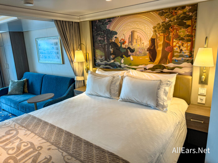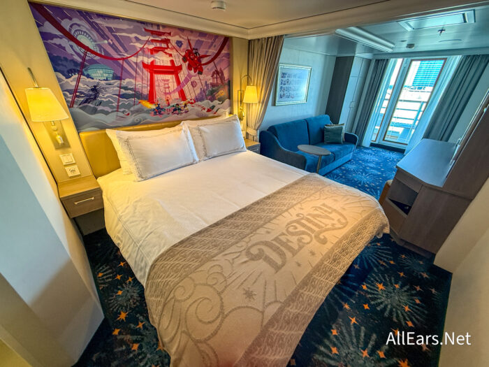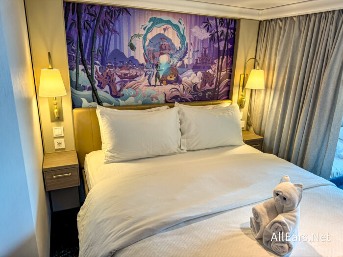 We’re on board for the very first time, but this isn’t just any Disney cruise — this is the FIRST Disney cruise ship to be themed after Disney Heroes and Villains, and they’re NOT playing around with this theming! The theming is in every corner, and we’re obsessed — the decor, the statues, the character meet and greets, the dining, the entertainment, you name it! However, one of the biggest areas you’ll be able to see the theming is in the staterooms, and you’ll be put in a Heroes themed room. Here’s what you can expect to see!