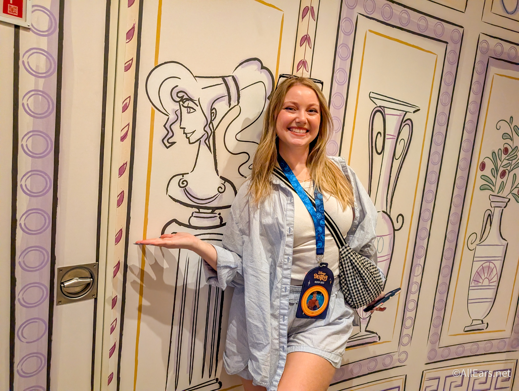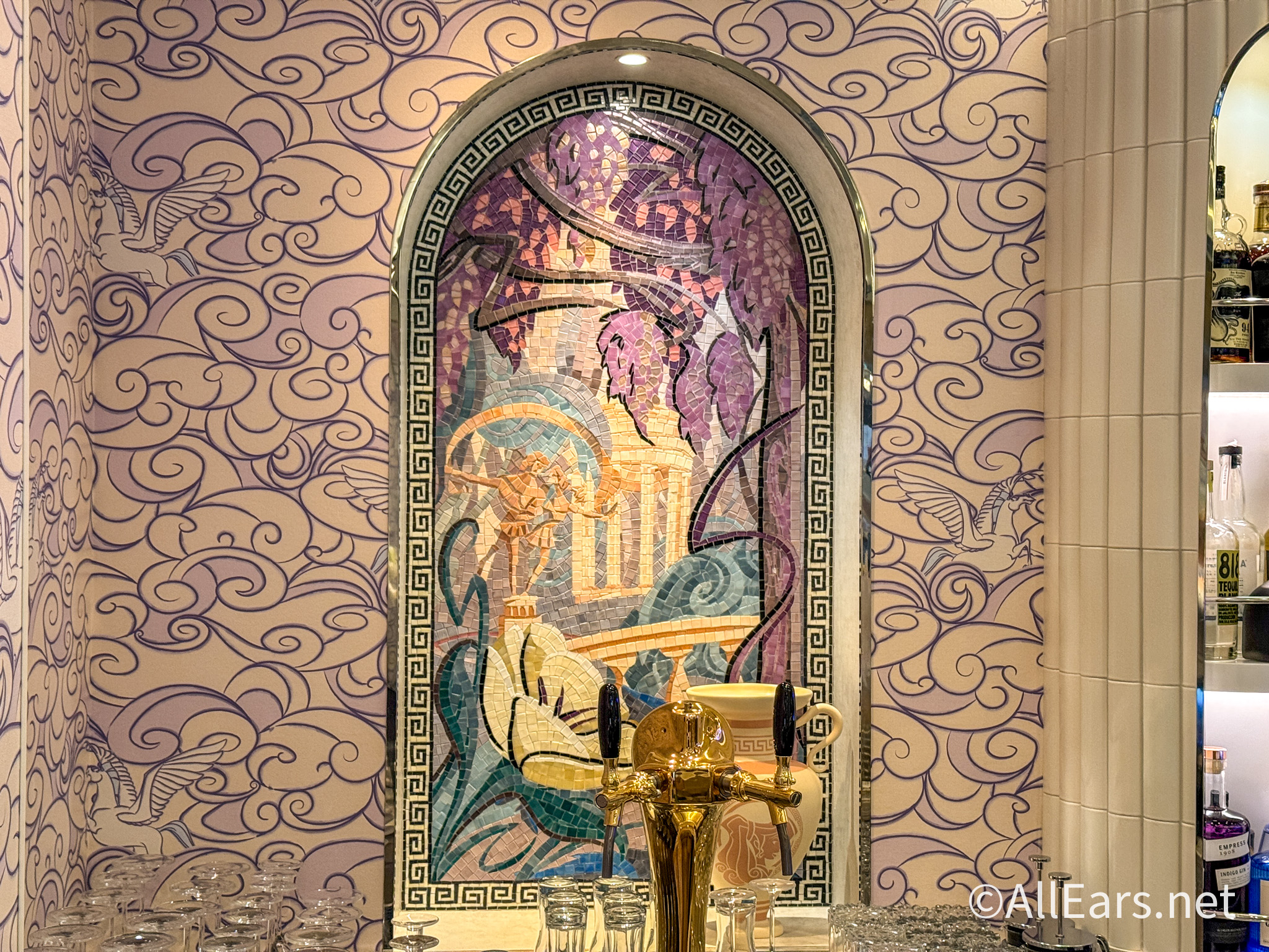 The wall has a nice cloud design — can you find Pegasus hidden in the clouds? We love the beautiful mosaic of the iconic scene when Meg sings “I Won’t Say I’m In Love”. There’s also a pink and white vase with Meg’s face on it right in front of the mosaic.