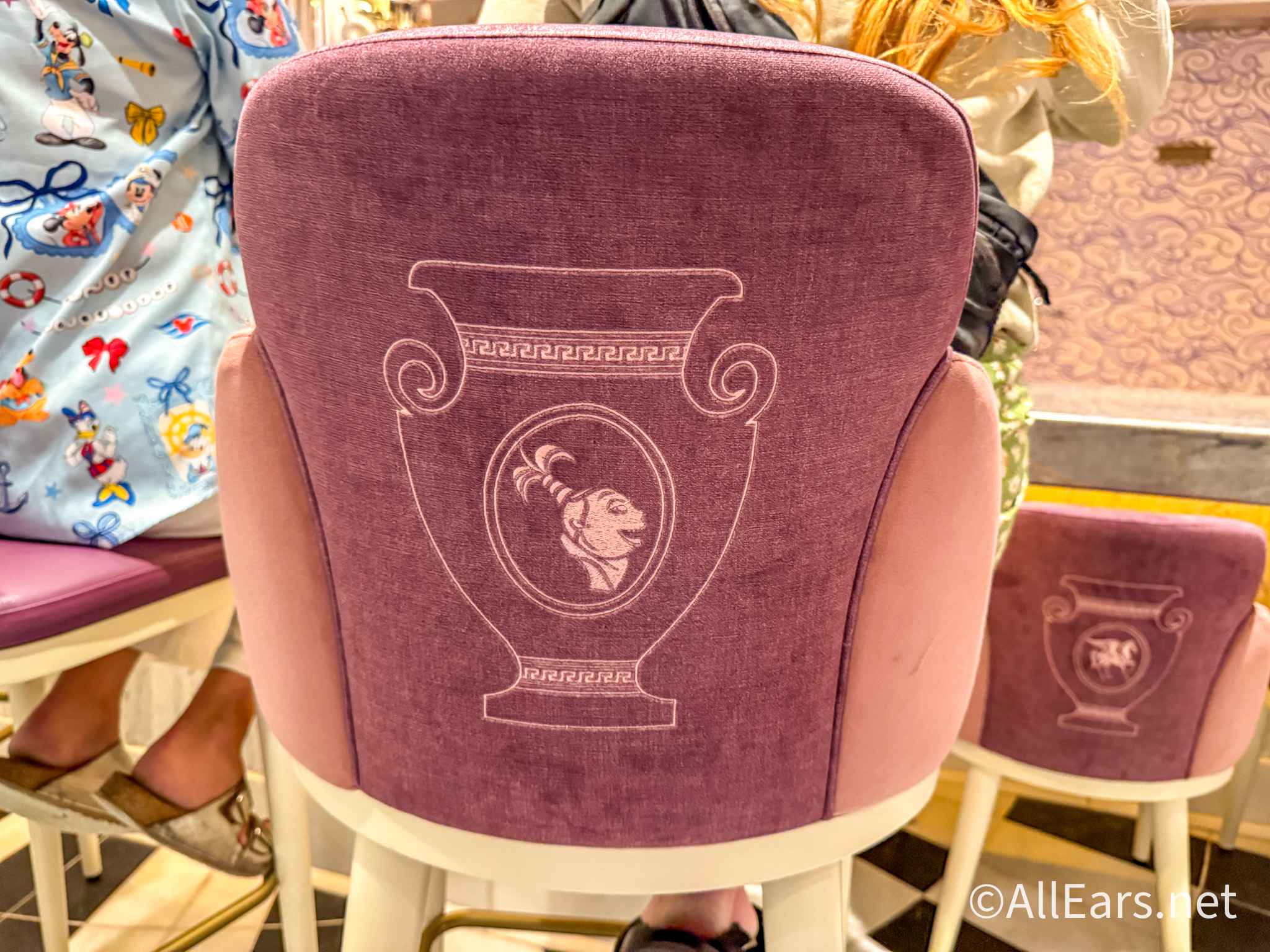 Everywhere that there can be detail, there is detail! On the back of the bar chairs, you’ll find vases with the faces of Meg, Hercules, and the muses.