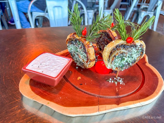 At Jock Lindsey’s Holiday Hangar Bar, we tried FOUR of the special holiday menu items. Starting out strong, we had the A Wreath of Wellington, which is Strip steak, mushroom duxelles, Gruyère, puff pastry, herbed parmesan, and horseradish-mustard aïoli for $19.