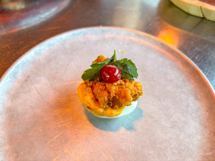 We enjoyed the flavor of these, and the fact that the chicken on top was crispy on the outside and juicy inside, but these did NOT stay together. The filling is also supposed to be a sweet potato, but it tastes like garlic butter and egg yolk whipped together and put on top. The egg on the bottom was tender and held up to the ingredients on top, but we do warn you that there is a bit of a kick here due to the seasoning. Overall, if you enjoy devilled eggs, this is certainly a great one to try!
