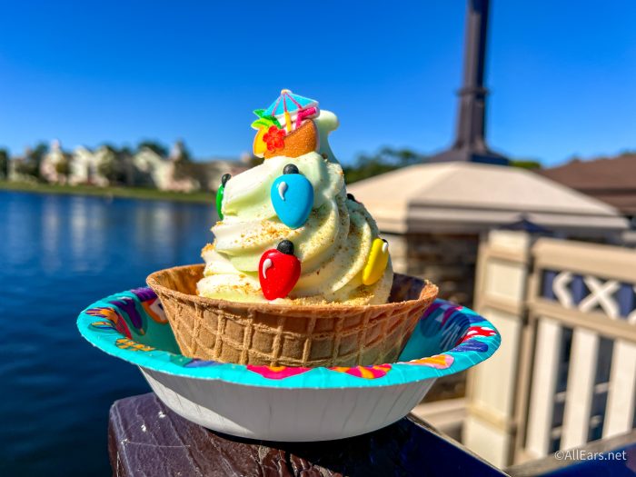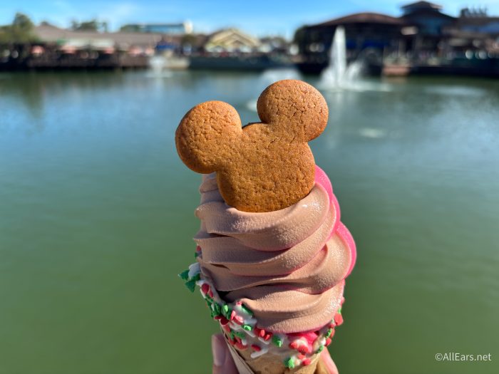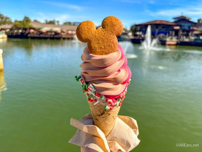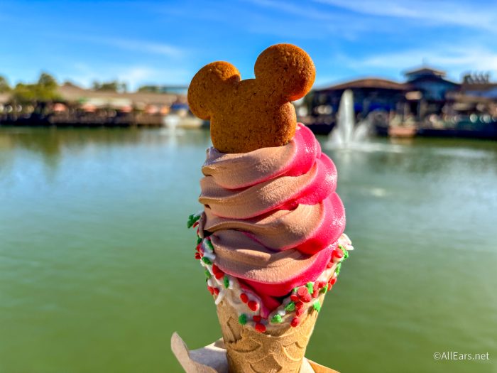 Swirls on the Water has three holiday offerings available right now for the holidays, starting with the Mickey Gingerbread Cone, which is a gingerbread cone with chocolate soft-serve, DOLE Whip pomegranate, holiday sprinkles, and gingerbread Mickey for $7.49.
