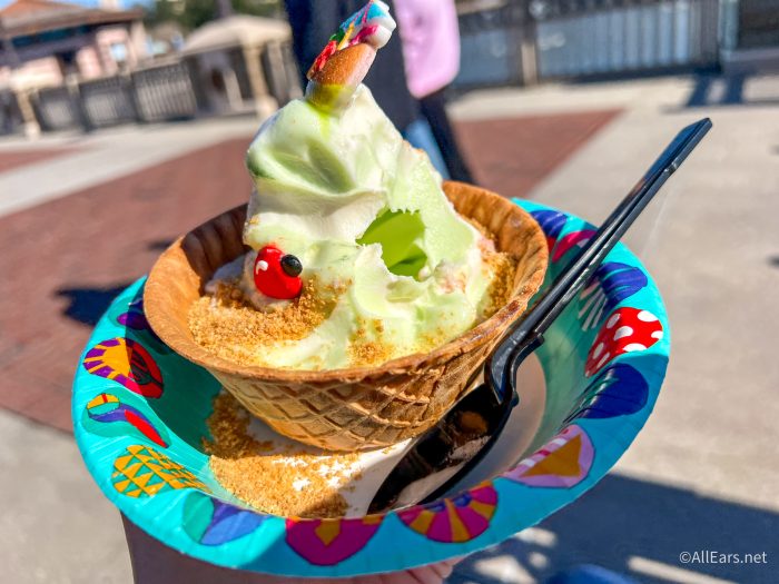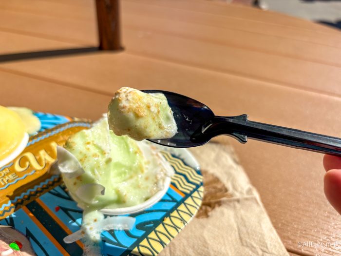 The lime DOLE Whip was classic in the best way — super smooth, bright, acidic but not overwhelmingly tart. It has a great balance, especially with the coconut mixed in. The sugar lights on the side are crunchy and super sugary, adding a great texture, and we loved that the bowl is a traditional waffle bowl that held up really well and holds a great amount of soft serve!