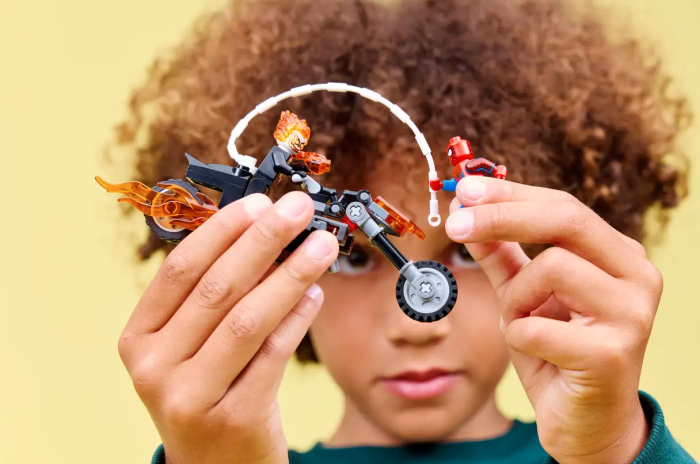 You get a minifigure of Spider-Man as well as one of Ghost Rider, and his motorcycle features 2 flaming tailpipes and 2 built-in stud shooters.