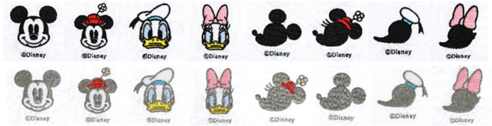 The lineup of available Disney embroidery options — which went on sale November 18th, AKA Mickey and Minnie’s birthday — costs $15.00 and includes Mickey Mouse, Minnie Mouse, Donald Duck, and Daisy Duck in two color palettes, along with their silhouettes.