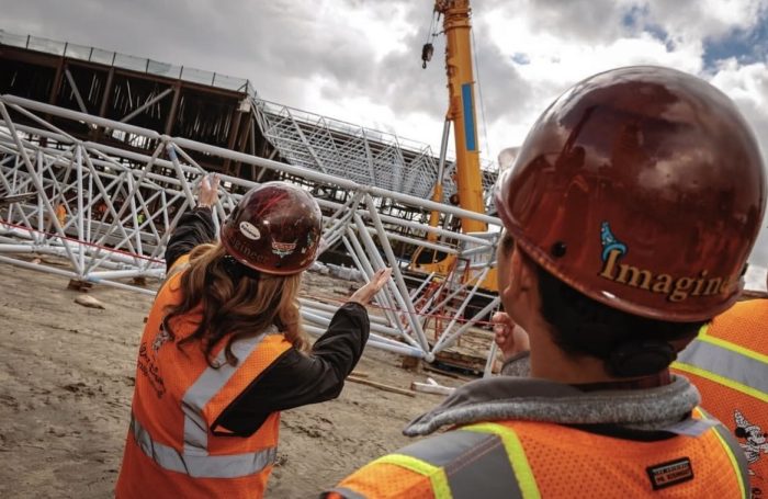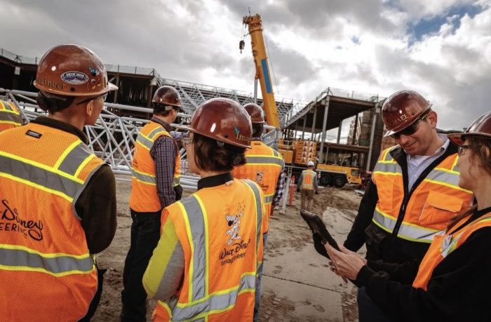 Imagineering shared a couple of images of the team, with the canopy under construction in the background. It is an exciting step towards this new area of Avengers Campus being a reality.