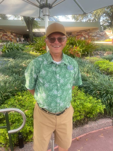 Well, now, those Cast Members have new shirts. The shirts are still green, but now they have a nice little swirly pattern with leaves (which is PERFECT for The Land). A huge thank you to our reader, Brandon Shahniani, for sending us the photo. We think this new look is SHARP and way more interesting than plain shirts. It looks like khaki pants are still in, along with a solid beige hat.