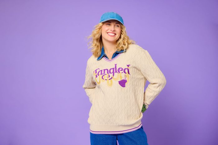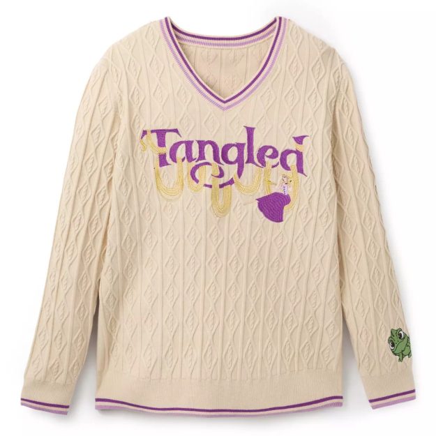 The sweater features Rapunzel swinging on her hair from the Tangled logo! Little Pascal is on the sleeve hanging out, too. I’m obsessed with the embroidered details that give this sweater so much life, and it looks pretty comfy!