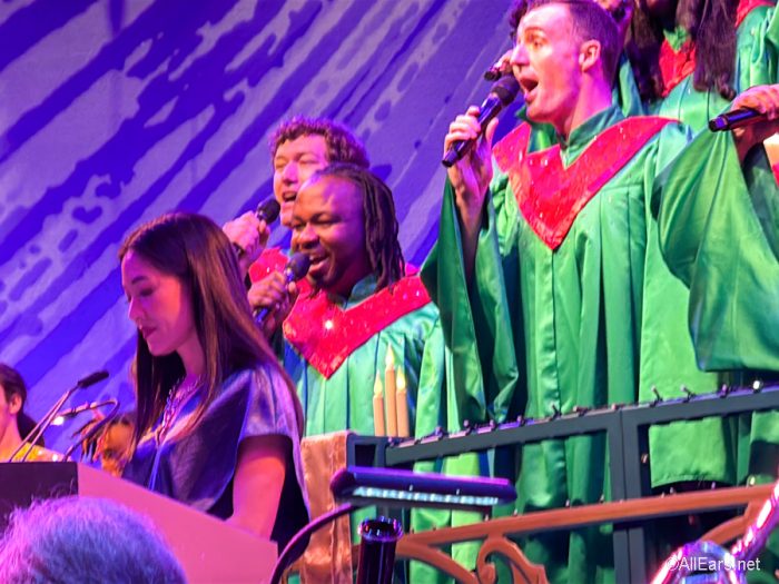 In addition to these offerings, there is plenty of live entertainment to enjoy. One of the most popular offerings is the Candlelight Processional. This show is a retelling of the Christmas story, narrated by a celebrity and accompanied by a 50-piece orchestra. You can watch this show daily at 5 PM, 6:45 PM, and 8:15 PM in the America Gardens Theatre. The celebrity narrator is different depending on the evening, and you can see a full list right here. When we attended, the narrator was Constance Wu.