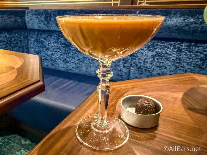 For our final drink, we had The Darkhold with Amaro Averna, Patron XO Cafe Agave Nectar, Milk, Salted Caramel Ethel M Chocolates for $15. This is definitely a sweet drink, but it was one of our favorites from the lounge. It’s served warm and perfect for dessert. The server pours it from a Moka pot, then unscrews the bottom to reveal a chocolate truffle. There was even salted caramel foam that dissolved into the drink when it was poured.