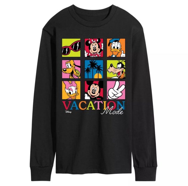 The Vacation Mode Long Sleeve Graphic T-Shirt features the “Vacation Mode” text again, along with image blocks including Mickey, Minnie, Donald, Daisy, Pluto, and Goofy! This men’s long-sleeve shirt comes in a variety of sizes and colors.