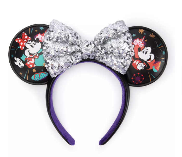The ears themselves are black with purple on the inside of the band. Mickey and Minnie are both on their respective ears with Sleeping Beauty Castle in the background, and a sparkly silver bow brings it all together.