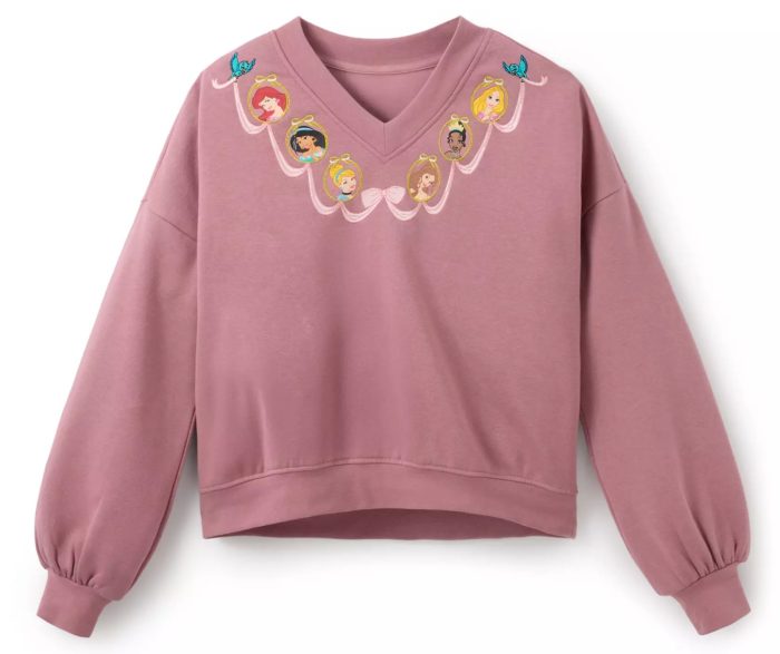 You’ll find Ariel, Jasmine, Cinderella, Belle, Tiana, and Rapunzel all outlined with a pretty ribbon. The sweatshirt is a dusty pink.
