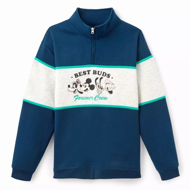 Best buds will want to get the Mickey and Friends 1/4 Zip Pullover Sweatshirt. This shirt features Mickey, Pluto, Goofy, and Donald, all of Mickey’s best friends!